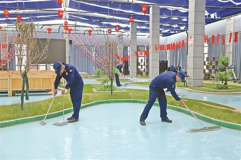 圖為消防員在認真打掃衛(wèi)生。記者 彭琦 攝