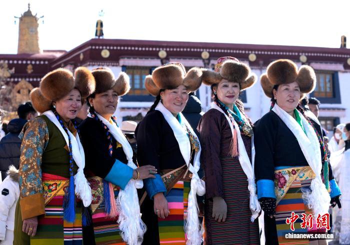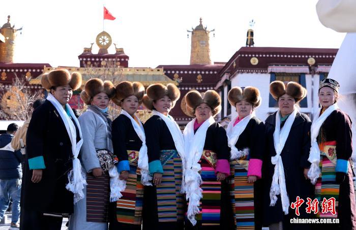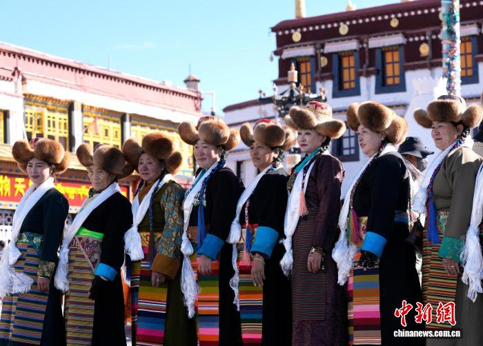 圖為拉薩婦女盛裝在大昭寺廣場(chǎng)合影。中新社記者 李林 攝