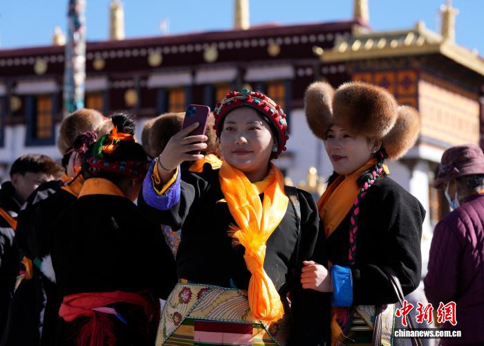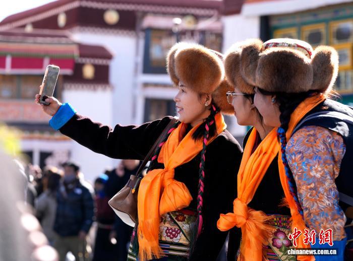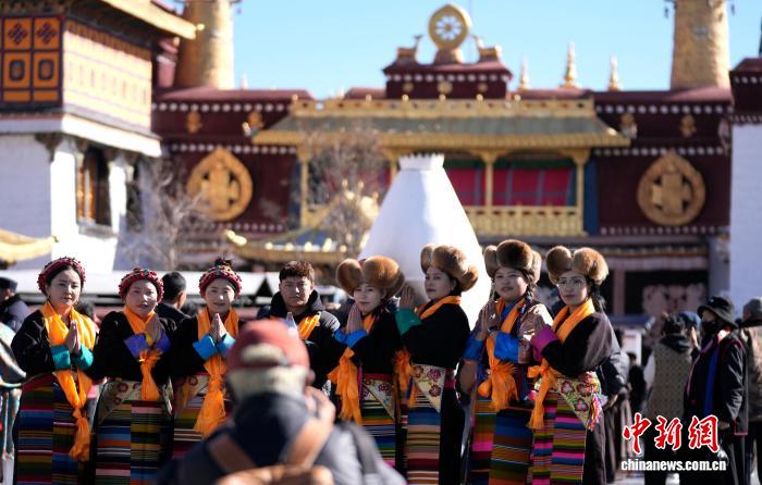 圖為拉薩婦女盛裝在大昭寺廣場(chǎng)拍照。中新社記者 李林 攝
