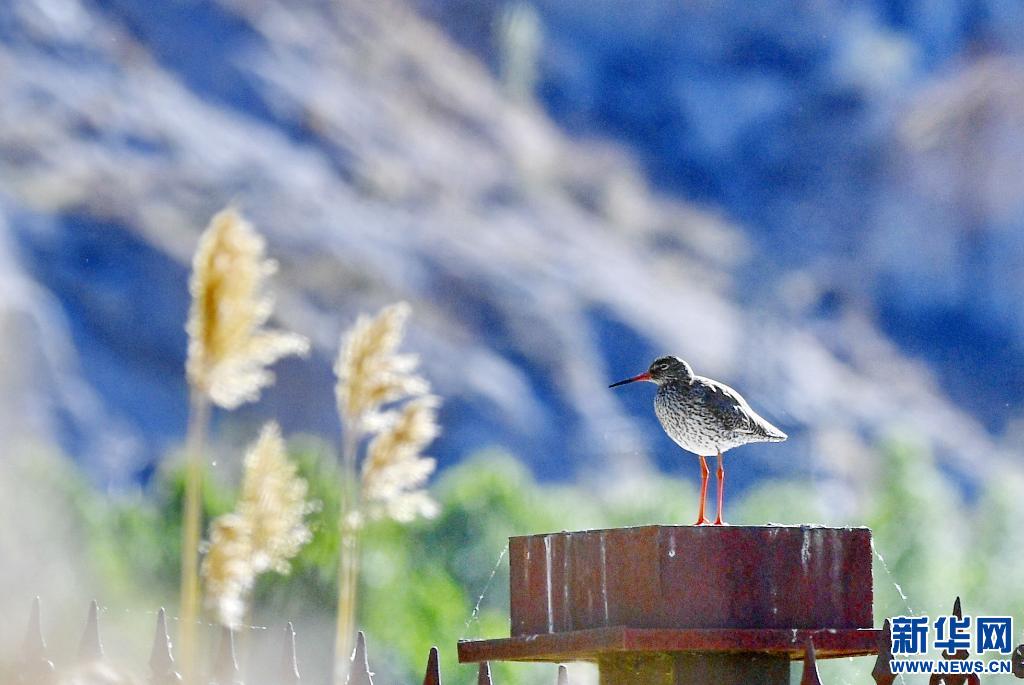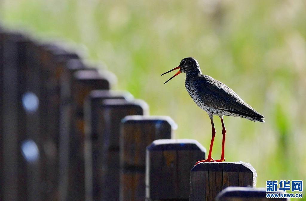在拉魯濕地人行步道欄桿上鳴叫的紅腿鷸(6月2日攝)。新華社記者 張汝鋒 攝