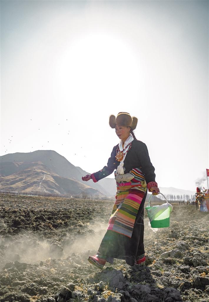 春耕儀式開始之前,犁手們依次吃糌粑、敬青稞酒、煨桑、獻(xiàn)哈達(dá),每個(gè)人臉上都流露著幸福的笑容?!拌F?!眰冊谔镩g一字排開,浩浩蕩蕩駛進(jìn)農(nóng)田,后面跟著盛裝打扮的姑娘,她們手持種子、肥料撒入農(nóng)田。這是來自春天的希望,希望秋收滿倉。
