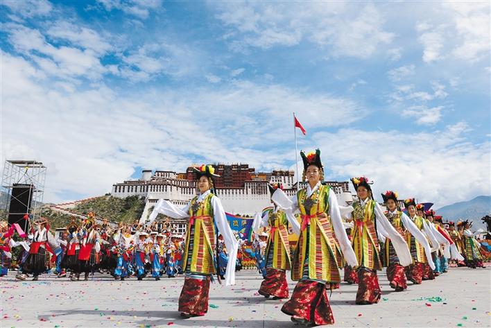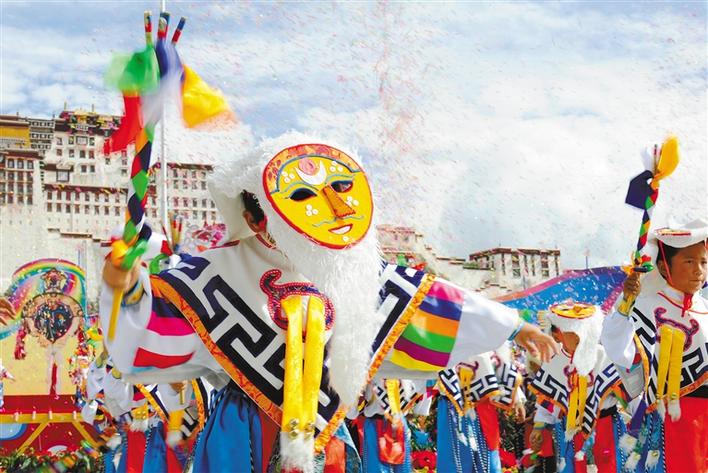 藏戲展演隊(duì)亮相布達(dá)拉宮廣場(chǎng)。