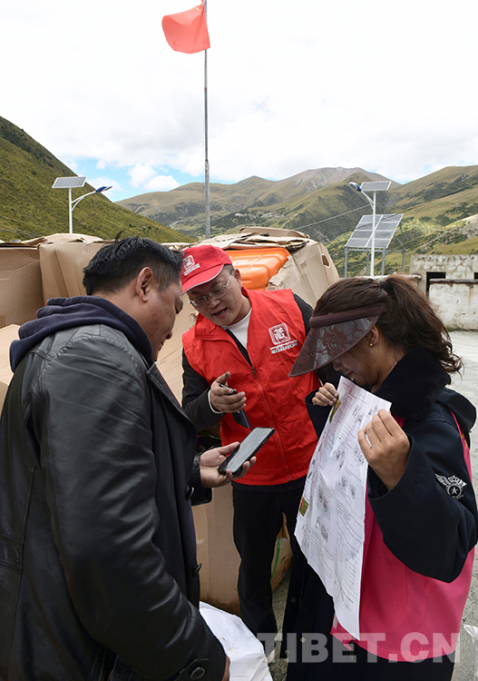這是北京建藏援藏工作者協(xié)會志愿服務(wù)組人員張建(中)在西藏那曲市索縣西昌鄉(xiāng)指導(dǎo)牧民群眾用手機掃碼進行高原撿拾車的視頻學(xué)習(xí)(唐召明2021年9月14日攝)