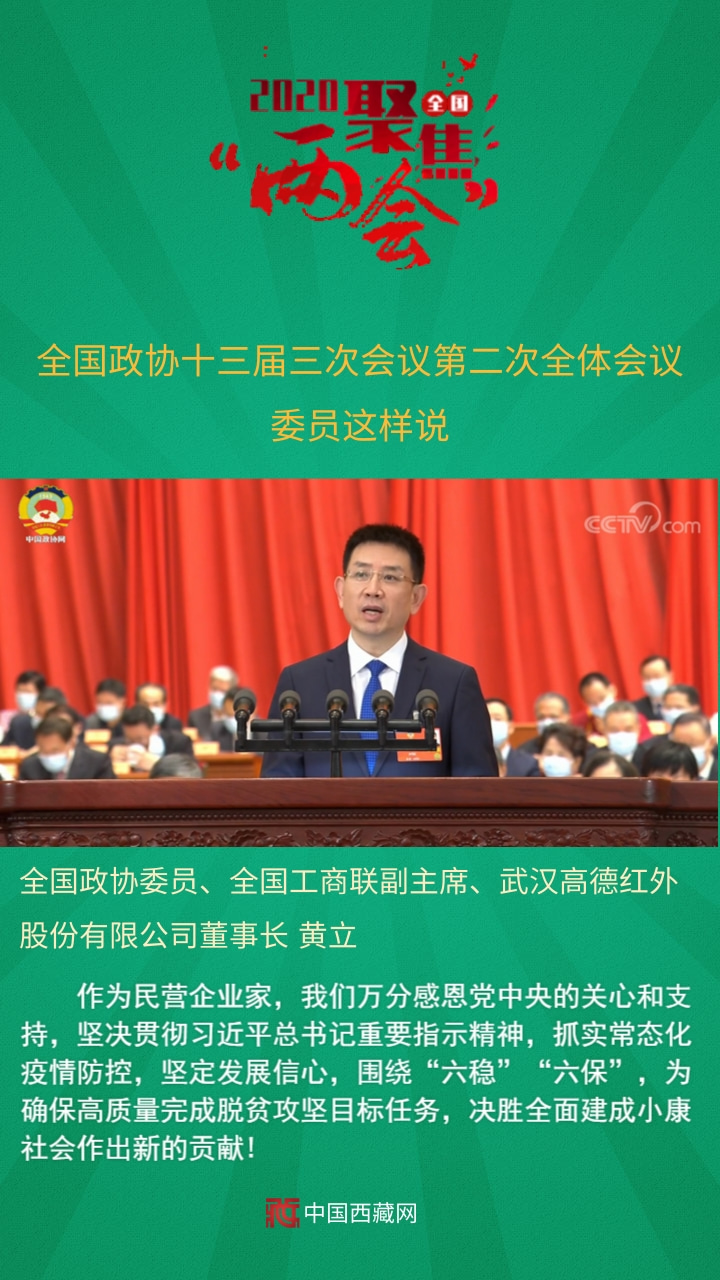 全國(guó)政協(xié)委員、全國(guó)工商聯(lián)副主席、武漢高德紅外股份有限公司董事長(zhǎng)黃立發(fā)言說,作為民營(yíng)企業(yè)家,我們?nèi)f分感恩黨中央的關(guān)心和支持,堅(jiān)決貫徹習(xí)近平總書記重要指示精神,抓實(shí)常態(tài)化疫情防控,堅(jiān)定發(fā)展信心,圍繞“六穩(wěn)”“六?!保瑸榇_保高質(zhì)量完成脫貧攻堅(jiān)目標(biāo)任務(wù),決勝全面建成小康社會(huì)作出新的貢獻(xiàn)!
