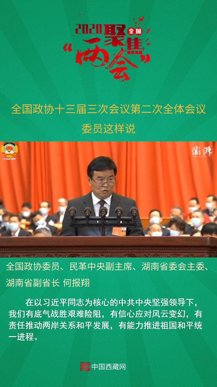 全國(guó)政協(xié)委員、民革中央副主席、湖南省委會(huì)主委、湖南省副省長(zhǎng)何報(bào)翔發(fā)言說,在以習(xí)近平同志為核心的中共中央堅(jiān)強(qiáng)領(lǐng)導(dǎo)下,我們有底氣戰(zhàn)勝艱難險(xiǎn)阻,有信心應(yīng)對(duì)風(fēng)云變幻,有責(zé)任推動(dòng)兩岸關(guān)系和平發(fā)展,有能力推進(jìn)祖國(guó)和平統(tǒng)一進(jìn)程。