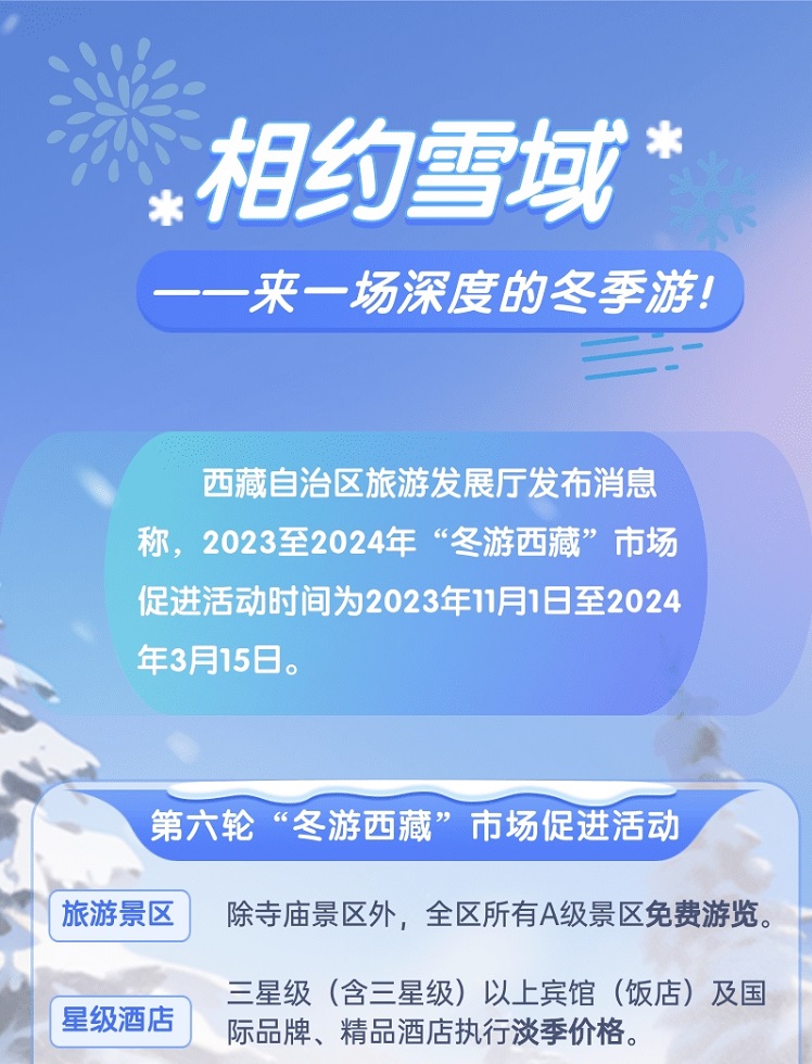西藏自治區(qū)旅游發(fā)展廳發(fā)布消息稱,2023至2024年“冬游西藏”市場促進活動時間為2023年11月1日至2024年3月15日。[詳細]