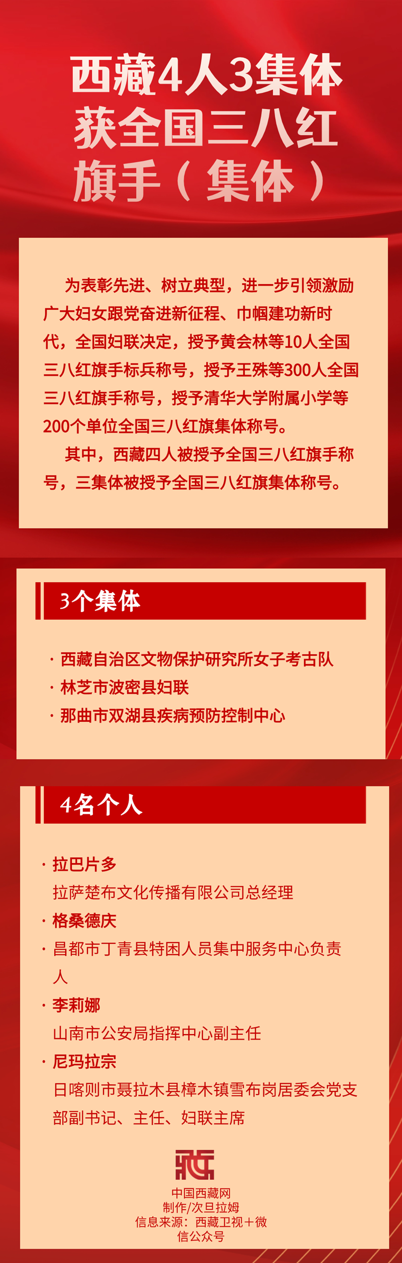西藏4人3集體獲全國三八紅旗手(集體)