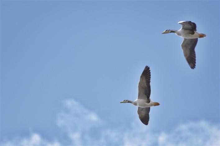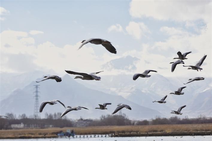 遠(yuǎn)處,連綿起伏的山頂還覆蓋著薄薄的積雪,布達(dá)拉宮雄偉而秀美;近處,濕地內(nèi)隨意顯現(xiàn)出的一塊塊水泊,成群的候鳥(niǎo)在水中玩耍嬉戲、在藍(lán)天白云下飛舞。見(jiàn)到可愛(ài)的飼養(yǎng)員帶來(lái)它們喜歡的麥粒,斑頭雁、紅隼、赤麻鴨、黃鴨等紛紛游上岸來(lái),盡情地享受美食,發(fā)出歡快的叫聲。