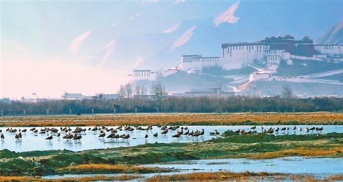 遠(yuǎn)處,連綿起伏的山頂還覆蓋著薄薄的積雪,布達(dá)拉宮雄偉而秀美;近處,濕地內(nèi)隨意顯現(xiàn)出的一塊塊水泊,成群的候鳥(niǎo)在水中玩耍嬉戲、在藍(lán)天白云下飛舞。見(jiàn)到可愛(ài)的飼養(yǎng)員帶來(lái)它們喜歡的麥粒,斑頭雁、紅隼、赤麻鴨、黃鴨等紛紛游上岸來(lái),盡情地享受美食,發(fā)出歡快的叫聲。