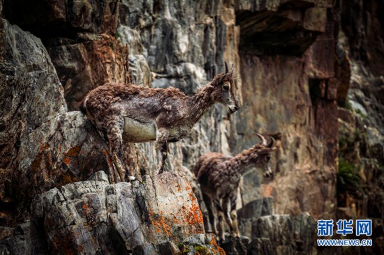 兩只巖羊在巖壁上行走。新華網(wǎng) 宋忠勇 攝