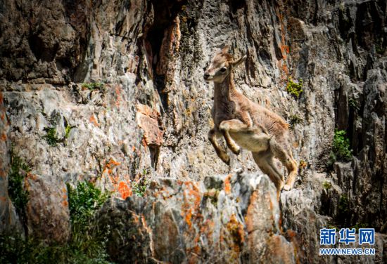 一只巖羊在巖壁上跳躍。新華網(wǎng) 宋忠勇 攝