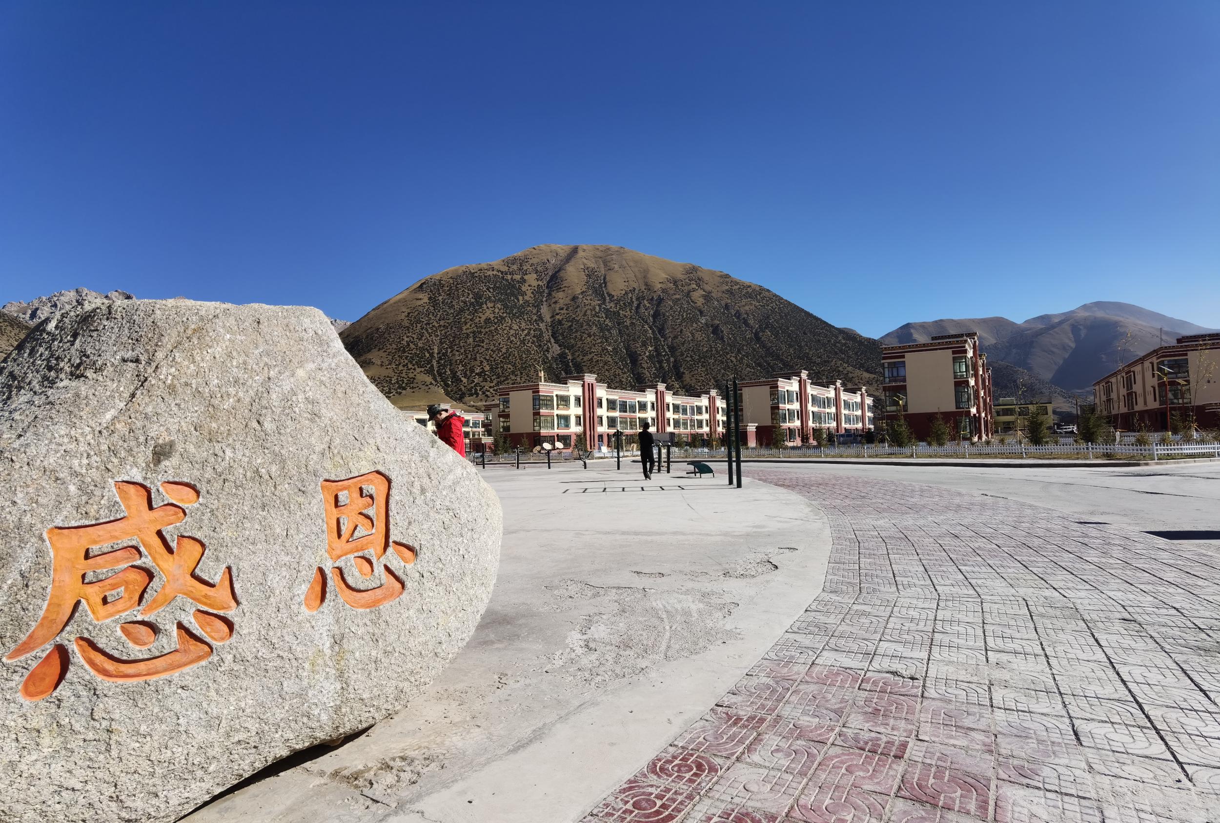 “牧民希望家園”小區(qū)內的一個石頭上,“感恩”兩個紅色大字格外顯眼
