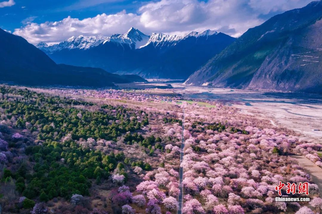 每年三、四月間,東起波密縣,經(jīng)巴宜區(qū),米林縣,西至工布江達(dá)縣,朗縣,田野間,江河畔,村舍旁,千年古桃樹樹干遒勁,樹高花繁,千山萬壑花開成海,是望不盡的百里桃花。