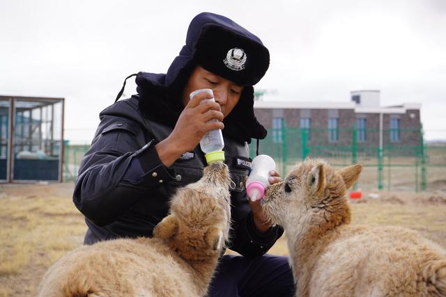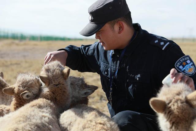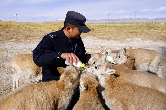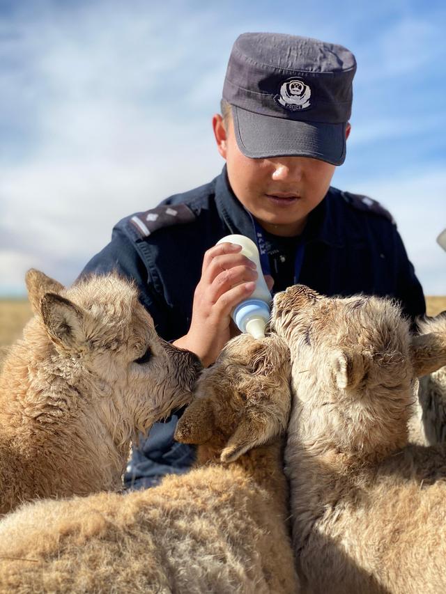12月7日,在給藏羚羊幼仔喂奶前,可可西里索南達(dá)杰保護(hù)站站長趙新錄(中)用嘴測試奶溫。