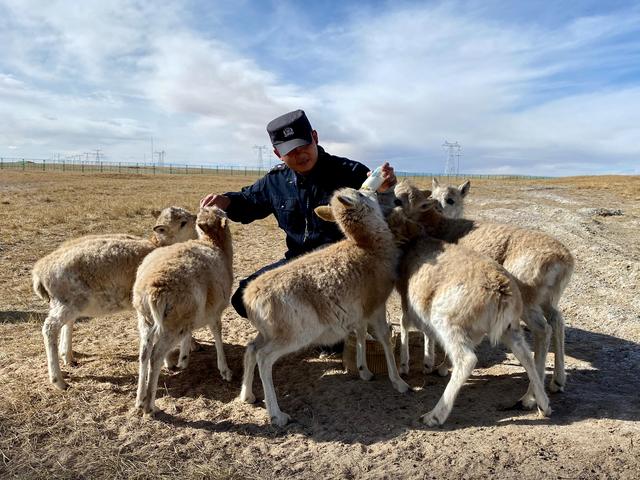 12月7日,可可西里巡山隊(duì)員達(dá)才在給藏羚羊幼仔喂奶。