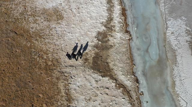 12月7日,站長趙新錄(中)與隊(duì)友鄧海平(左)、達(dá)才在可可西里索南達(dá)杰保護(hù)站管護(hù)區(qū)域內(nèi)巡查(無人機(jī)照片)。