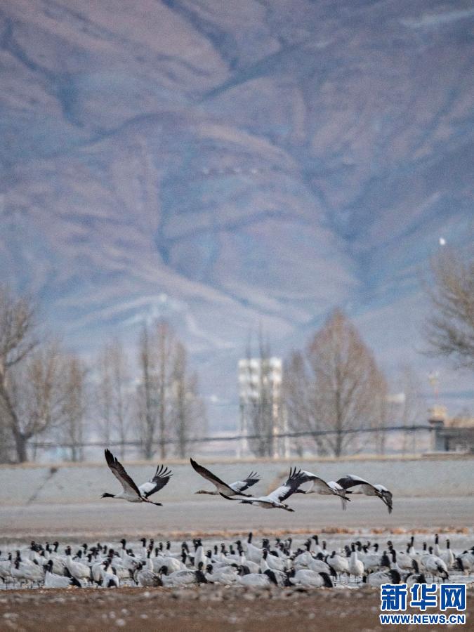 黑頸鶴在自然保護區(qū)里飛翔(2021年1月3日攝)。新華社記者 張汝鋒 攝