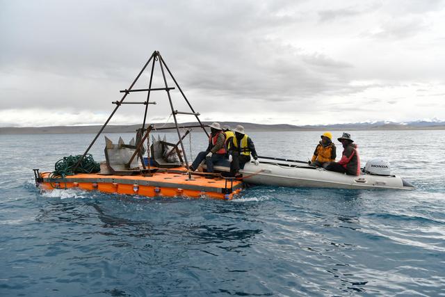 第二次青藏科考納木錯(cuò)湖泊科考團(tuán)隊(duì)利用搭建好的水上平臺,計(jì)劃鉆取100米深的湖芯,分析研究納木錯(cuò)地區(qū)10到20萬年以來古氣候的演變過程及其機(jī)理。圖為2019年7月6日,科研人員駕船推動浮動平臺到指定區(qū)域投放錨鏈。新華社記者 李鑫 攝