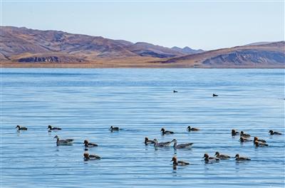 羊卓雍錯自2014年被納入國家良好湖泊生態(tài)環(huán)境保護試點工程項目以來,羊卓雍錯周邊生態(tài)環(huán)境持續(xù)向好,棲息繁衍的野生動物數(shù)量逐年增多。這是近日拍攝的羊卓雍錯湖面上的水鳥。新華社記者 孫非 攝