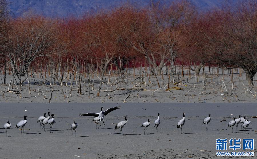 雅魯藏布江河床上的黑頸鶴(2月1日攝)。新華社記者 張汝鋒 攝