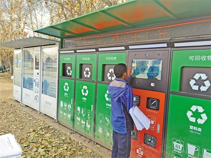 記者在林周縣城部分小區(qū)和學(xué)校內(nèi)看到,安裝的智能垃圾分類(lèi)設(shè)備已全部投入使用,智能分類(lèi)回收箱箱體上標(biāo)注著“紙張”“塑料”“金屬”等各類(lèi)名稱。學(xué)生們只要在設(shè)備端口掃描校園班級(jí)卡上的二維碼,把廢紙、塑料瓶等垃圾依次分類(lèi)放入“智能回收箱”,垃圾分類(lèi)箱便會(huì)根據(jù)投放的垃圾自動(dòng)稱重計(jì)算積分,并在學(xué)生的校園班級(jí)卡賬戶上增加相應(yīng)的“垃圾兌換積分”,使用積分就可以在平臺(tái)兌換作業(yè)本、紙筆等學(xué)習(xí)用品。