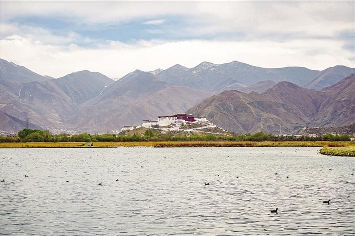 從拉薩市當(dāng)熱西路上向北望去,便能看到這塊北面靠山,東、南、西三面為市區(qū)包圍,面積12.2平方公里的濕地。遠(yuǎn)處,連綿起伏的山頂還覆蓋著薄薄的積雪,布達(dá)拉宮雄偉而秀美;近處,濕地內(nèi)隨意顯現(xiàn)出的一塊塊水泊,成群的候鳥在水中玩耍嬉戲、在藍(lán)天白云下飛舞。拾階過橋,一條木質(zhì)長廊向濕地中延伸,只是我們這些不速之客的到來,驚起水鳥無數(shù)。它們仿佛商量好似的沖上藍(lán)天,讓人為打擾它們的棲息而不安。