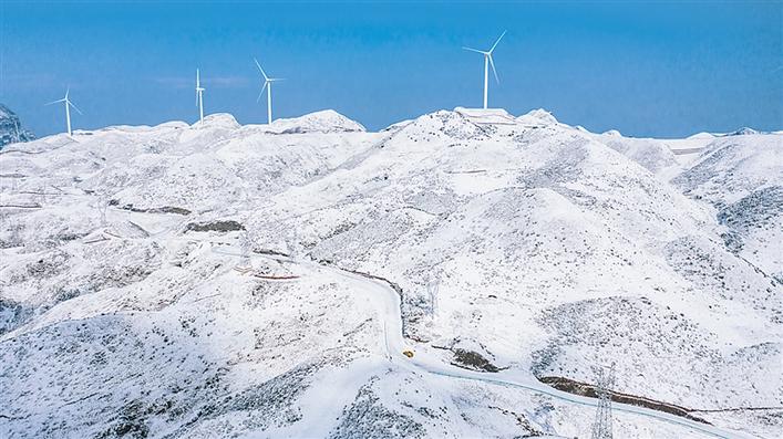 雪后的貴州盤縣四格風(fēng)電場(2021年1月12日攝,無人機照片)。 新華社記者 陶亮 攝