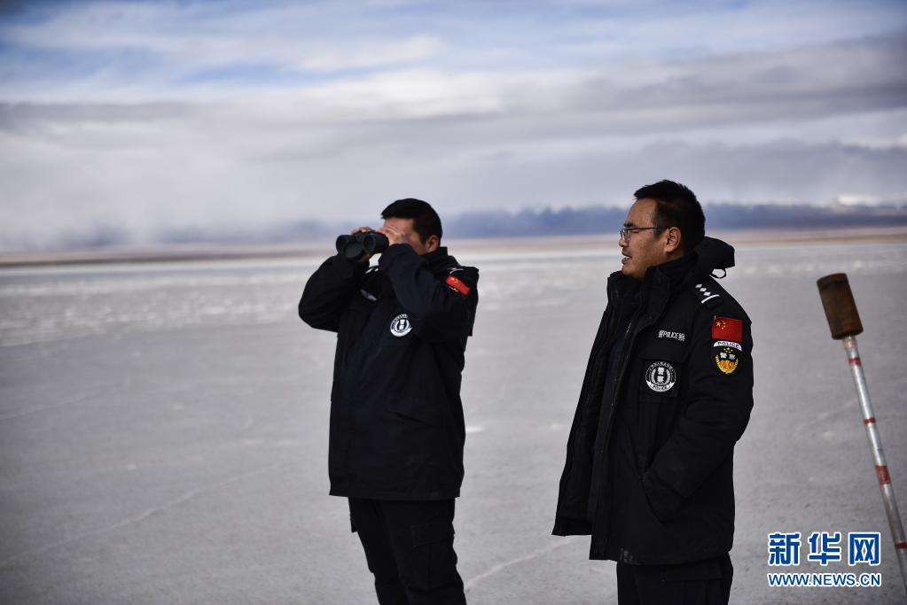 4月20日,袁廣明在可可西里巡山途中查看遷徙中的藏羚羊群。新華社記者 吳剛 攝