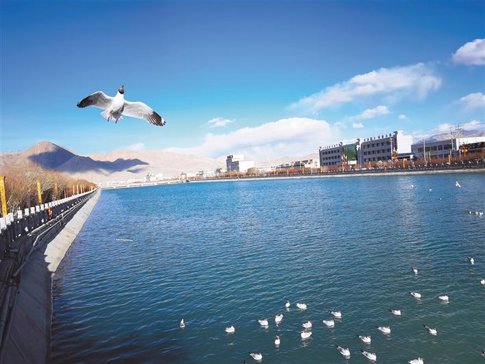 圖為阿里地區(qū)獅泉河畔,碧水藍天,候鳥飛翔。記者 史金茹 通訊員 王倆合 攝