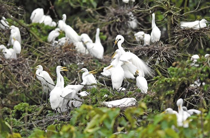 近期,在位于鄱陽湖畔的江西省南昌市新建區(qū)象山森林公園內(nèi),已安家筑巢的鷺鳥進(jìn)入孵化哺育旺季。象山森林公園有著“鷺鳥王國”的美譽,每年都會吸引白鷺、蒼鷺、夜鷺等種類的鷺鳥飛抵棲息和繁衍后代。 白鷺在南昌市新建區(qū)象山森林公園內(nèi)棲息(5月18日攝)。新華社記者 萬象 攝