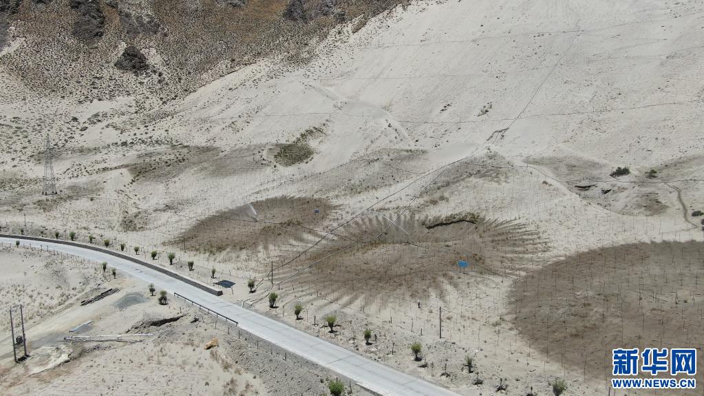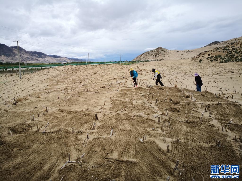 在山南市雅魯藏布江河谷地帶,村民們在維護(hù)固沙用的草方格(2019年7月14日攝)。新華社發(fā)(資料照片)