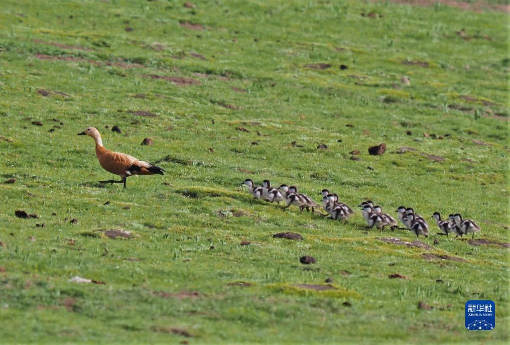 這是在四川省阿壩藏族羌族自治州若爾蓋縣境內(nèi)拍攝的帶著多只幼崽的赤麻鴨(2021年6月6日攝)。新華社 王冀川 攝