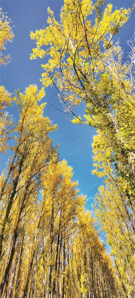 郊外的小樹林,澄澈的藍空和燦爛的黃葉相映成景。