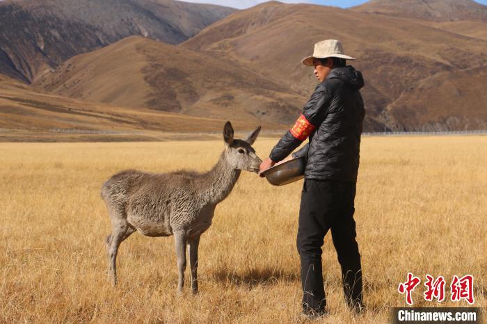 圖為西藏類烏齊馬鹿國家級(jí)自然保護(hù)區(qū)的管護(hù)員正在飼喂馬鹿?!∪轿木?攝