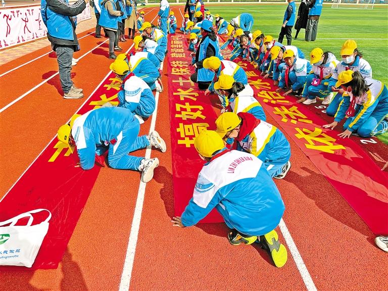 圖為林芝市第二小學的學生們在愛護水土資源宣傳標語上簽名。記者 張猛 攝