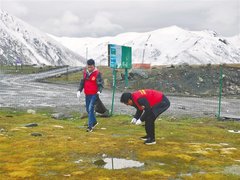圖為該支部黨員在薩普雪山風(fēng)景區(qū)撿拾垃圾。記者 萬(wàn)靖 攝