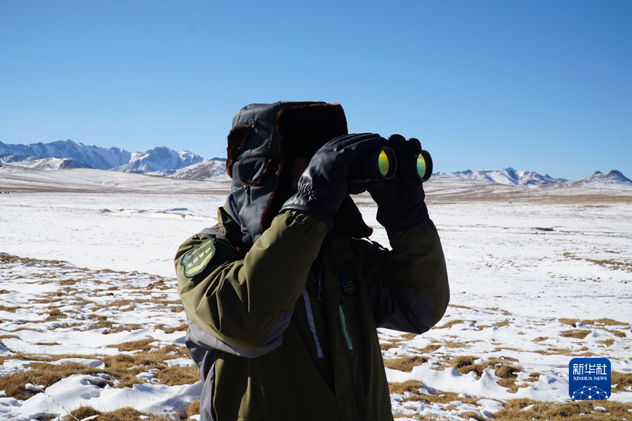 12月3日,祁連山國家公園沙龍灘管護(hù)站生態(tài)管護(hù)員楊有財(cái)用望遠(yuǎn)鏡觀測(cè)。新華社記者 耿輝凰 攝