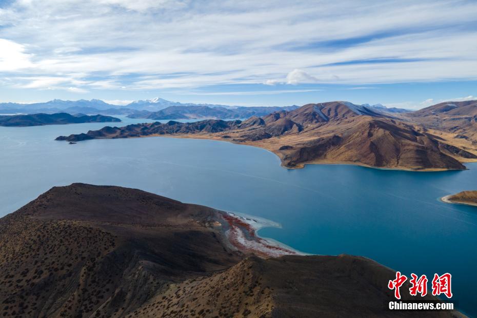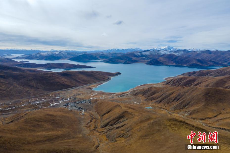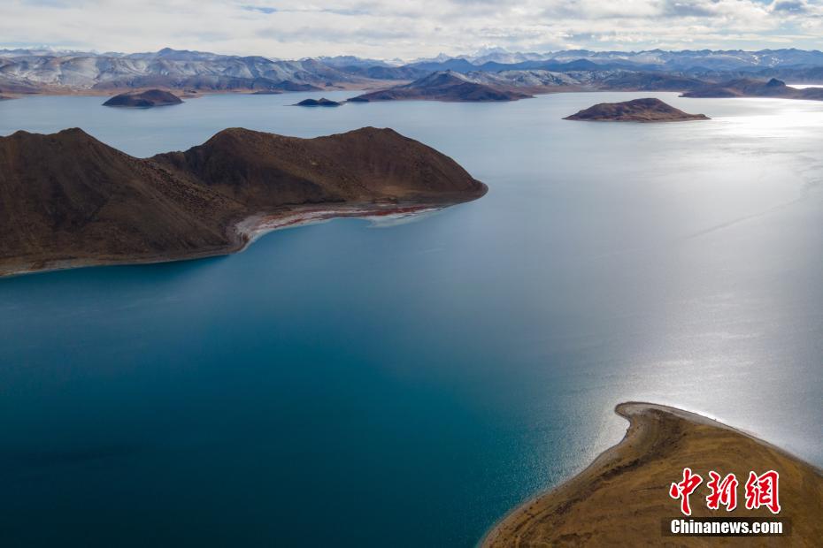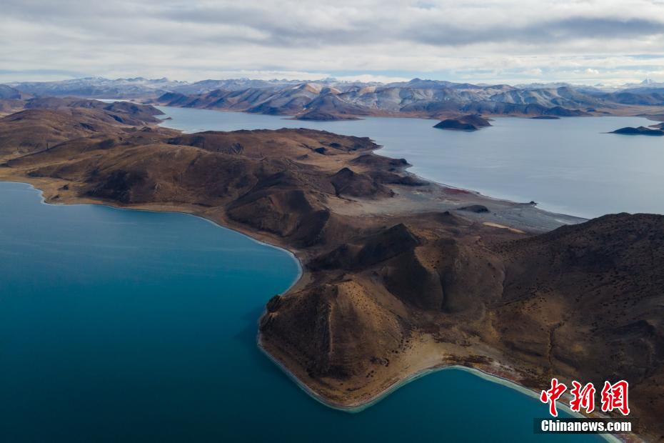 航拍羊卓雍錯與遠處的雪山。 江飛波 攝