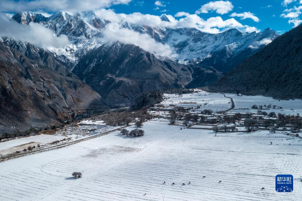 當日,西藏林芝市米林縣派鎮(zhèn)雅魯藏布大峽谷附近普降瑞雪,銀裝素裹的雅魯藏布江和南迦巴瓦峰顯得格外壯美。