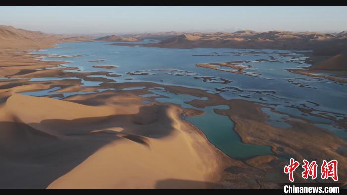 位于庫木庫里沙漠腹地的沙子湖薄冰化盡,蔚藍的湖水與金黃的沙山、遼闊的碧空交相輝映?!∩轩i 攝