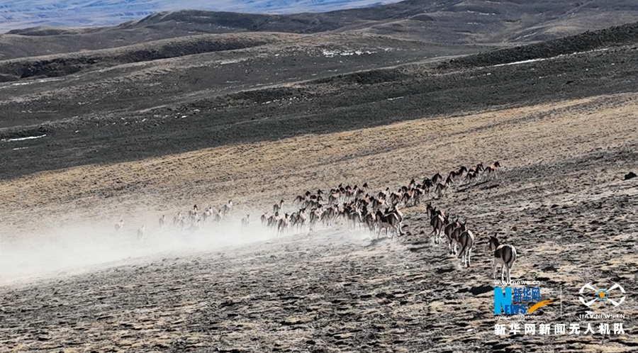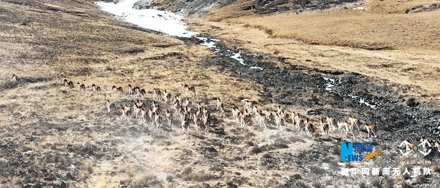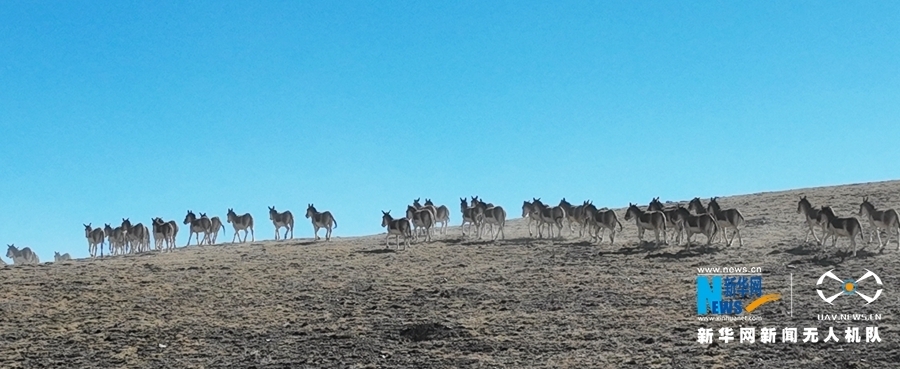 這是近日在甘肅省張掖市肅南裕固族自治縣祁豐藏族鄉(xiāng)禁牧區(qū)拍攝到的大種群藏野驢。新華網(wǎng)發(fā) 武雪峰 攝 飛手 安維斌