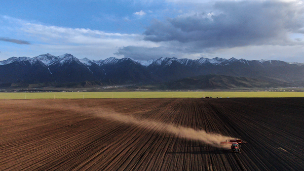 青海省三江集團門源種馬場的工人駕駛農(nóng)機在油菜田里播種(無人機照片)。記者 張宏祥 攝