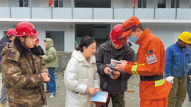圖為消防員在為施工單位工作人員宣傳防火知識(shí)。 記者 張猛 王珊 攝