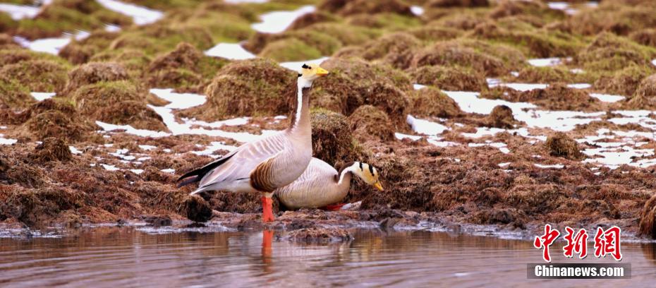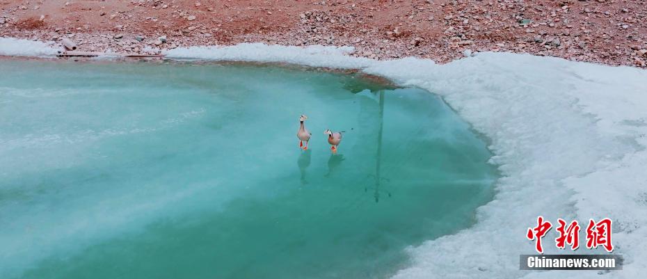 立夏以來,在位于祁連山國(guó)家公園內(nèi)的青海省海北藏族自治州祁連縣,當(dāng)?shù)孛癖娕臄z到多種野生動(dòng)物活動(dòng)影像。圖為斑頭雁在冰面行走。