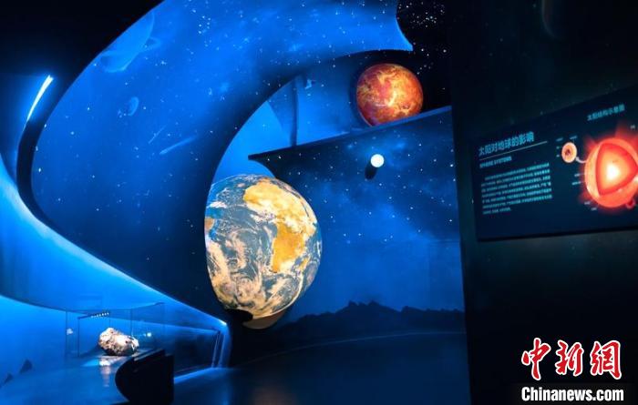 邁步進(jìn)入“地質(zhì)環(huán)境廳”,最最吸睛的,是一個(gè)巨大的、緩慢旋轉(zhuǎn)的“地球”,在深藍(lán)色的夜空背景下,地球上的紋理分毫畢現(xiàn)。頂層用微型燈組成的“星空”時(shí)不時(shí)有流星劃過(guò),照亮了太陽(yáng)系的其他行星。整個(gè)太陽(yáng)系被高仿真還原,帶光環(huán)的土星、赤紅色的火星、體積最大的木星……