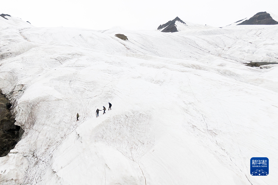 7月28日,來自長(zhǎng)江科學(xué)院的科考隊(duì)員在長(zhǎng)江源格拉丹東雪山上(無人機(jī)照片)。新華社記者肖藝九 攝