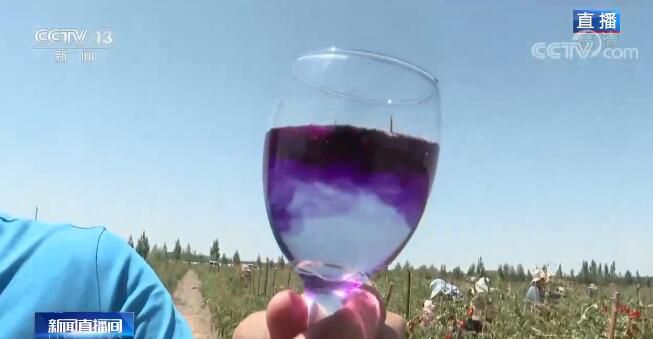 除了紅枸杞之外,這里還種植了15000多畝的有機(jī)黑枸杞,黑枸杞的成熟時(shí)間要遲一些,在8月下旬,所以我現(xiàn)在手里只有黑枸杞干。大家可以看一看,如果我們把它也像紅枸杞一樣泡入水中的話,顏色展開得非??欤瑤酌腌姷臅r(shí)間水就已經(jīng)是藍(lán)紫色了。當(dāng)?shù)氐呢?fù)責(zé)人告訴我,這很大程度是因?yàn)樗幕ㄇ嗨睾扛撸院阼坭揭灿辛硗庖粋€(gè)名字,叫作“花青素之王”。