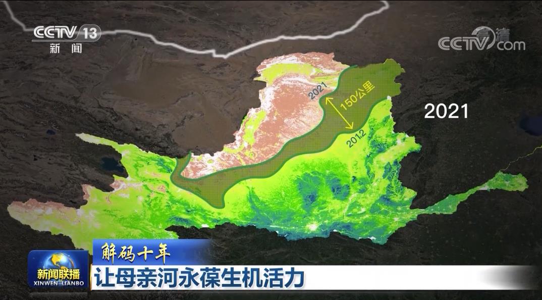這是衛(wèi)星視角拍攝到的黃河,研究人員連續(xù)數(shù)年監(jiān)測(cè),結(jié)合大數(shù)據(jù)還原了黃河沿岸的生態(tài)狀況??梢郧逦乜吹剑觊g綠進(jìn)沙退,這條黃河生態(tài)綠線最寬處向前推進(jìn)了約150公里。