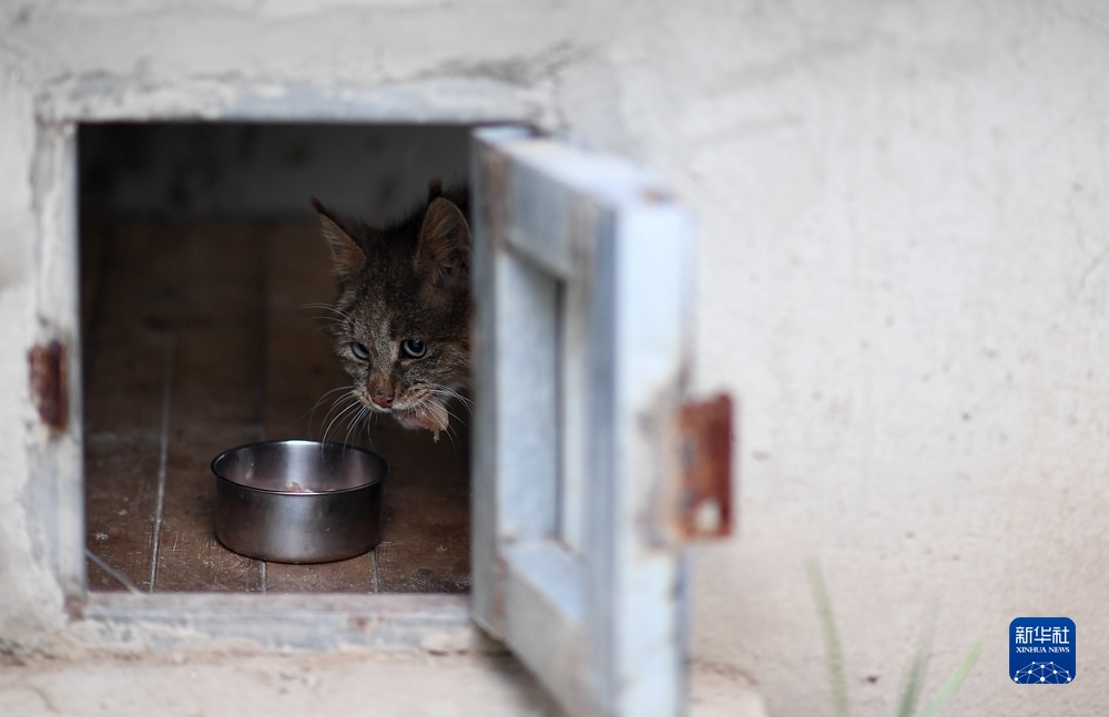 9月18日,受救護(hù)的荒漠貓在青海野生動物救護(hù)繁育中心進(jìn)食。新華社記者 張宏祥 攝