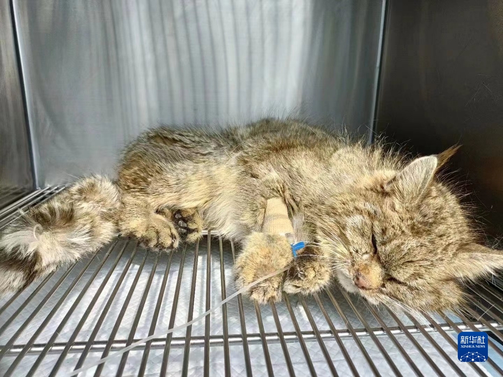 2022年3月21日,受救護(hù)的荒漠貓在青海野生動物救護(hù)繁育中心接受治療。新華社發(fā)(青海野生動物救護(hù)繁育中心供圖)